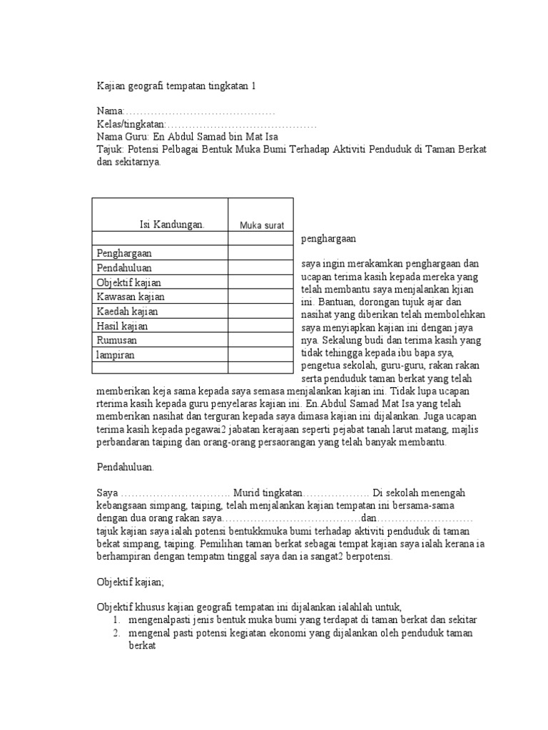 Pendahuluan saya telah menjalankan kerja kursus geografi tingkatan 1 yang bertajuk kajian lapangan tentang sisa domestik di. Kajian geografi tingkatan 1 cempaka Selasa 27 Oktober 2009. Apr 27 2021 contoh perwujutaan atas pemaknaan kalimat objektif.